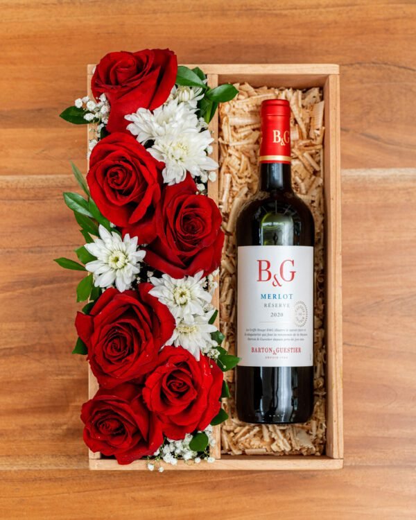 Caja de madera de selección de flores variadas y una botella de vino MERLOT RÉSERVE 2020 de la marca marca BARTON & GUESTIER