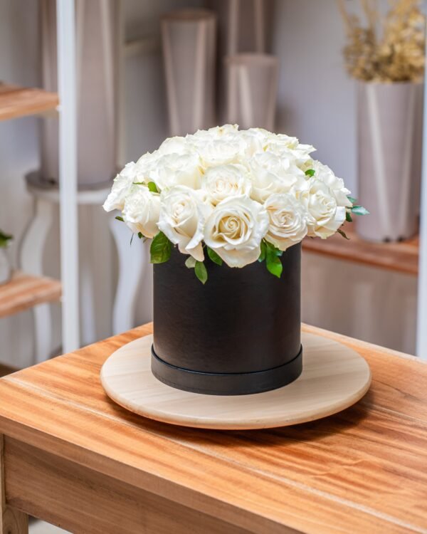 Arreglo compacto de selección de rosas en sombrerera negra de cartón con soporte para agua. Puede variar el tono de la flor. La foto de referencia es un arreglo talla M.